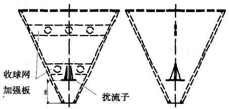 (3)經過與廠家協(xié)商,為克服循環(huán)水出口壓力偏高造成的膠球在收球網內的強烈旋轉,如圖2所示,在膠球清洗裝置內部加裝擾流子,要求擾流子材質為Q235,擾流子和收球網加強板要可靠地焊接。以降低凝汽器循環(huán)水出口的壓力及膠球在收球網內部的旋轉強度,從而使膠球順利地落入收球網底部,及時送入收球泵入口管道。