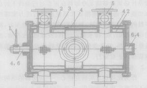 作為此項技術的研究核心—清洗器的結構設計不僅要實現膠球除垢、水流定向切換和膠球收、放球三者之間的有機結合,而且還要與清洗系統相配套。在綜合了熱電行業冷凝器系統采用的海綿膠球在線清洗技術的基礎上,將可完成水流定向切換換向閥的結構設計引入本清洗器的結構中,在清洗器的內部裝上收、放球設施,依靠清洗器的定向轉動實現水流定向切換和膠球收、放球功能,利用循環水系統以及系統的自身壓力完成對冷卻器管束的正反向膠球循環清洗過程,經中試后反復修改定型。