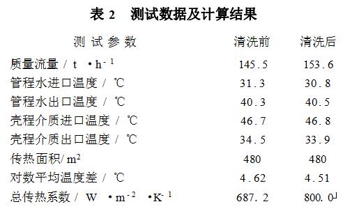 2003年6月在某煉油廠氣分裝置選擇脫丙烷塔1組2臺串聯塔頂冷凝器(該部位共計3組6臺冷凝器),其型號為FLB900-240-25-Ⅱ(B=200),管程介質為循環水,進口溫度為28~32℃,出口溫度為40~42℃,操作壓力為0.45MPa,質量流量為150×103kg/h;殼程介質主要為C2+C3,進口溫度48~50℃,出口溫度為46~47℃,操作壓力為1.95MPa,質量流量25×103kg/h。在1組2臺串聯冷凝器管、殼程出入口管線上分別安裝精密水銀溫度計及超聲波流量計,通過測試冷卻器清洗前、后冷卻器管、殼程出入口介質溫度和流量數據,計算出總傳熱系數的變化,以檢驗清洗效果。其測試的平均結果見表2。
