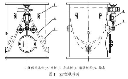 近幾年來,黃埔電廠、漳澤電廠、蘭州第二熱電廠等多家電廠均進行了設備改造,改造后的設備運行良好,收球率可達95%以上。改造后的收球網采用SF型,如圖1所示。1收球網本體;2網板;3導流板;4推進機構;5軸系圖1SF型收球網改造后的設備結構大大簡化,采用兩個網板,膠球經網板一次匯集即可由引出管引出。網板上存在雜物需要清洗時,將網板置反洗位。