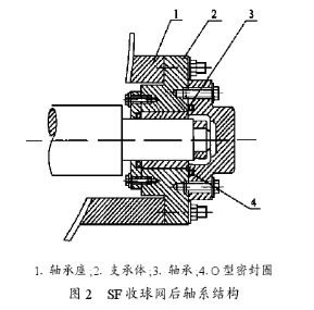 (4)傳動機構老產品的各個網板分別由各自的執行機構控制,在實際運行中容易出現不同步。老產品所用的電動執行機構自鎖性能也較差,不能控制網板平穩準確轉動,在實際運行中時常發生兩個網板沒有同時與外殼內壁貼緊,出現漏球。改造后,收球網兩個網板由同一個執行機構控制,又采用了大減速比的螺旋執行機構推進,動作平緩,自鎖性好,解決了網板不同步問題。在設備運行時,網板受到水流沖擊也不會發生抖動。1軸承座;2支承體;3軸承;4O型密封圈圖2SF收球網后軸系結構: