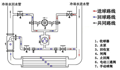 冷凝器清洗適合選全自動在線膠球清洗裝置安裝指導:在冷卻水循環管路上,加裝由發球器、收球器、控制器等管路系統組成的旁路,通過發球器將膠球注入冷凝器內,在系統自有壓力的作用下,對冷凝器銅管內壁的污垢進行自動清洗,在出水口端由收球器將膠球濾回至發球器,形成一次完整的清洗循環。通過控制系統可設定清洗頻率,實現自動在線清洗功能,使冷凝器銅管內壁始終處于清潔狀態,提高了換熱效率,并降低了能耗,從而達到節約能源的目的。