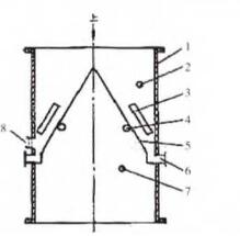 圖4改造后的A形雙箭式收球網(wǎng)縱剖面結(jié)構(gòu)注:1捕環(huán)水管管壁;2網(wǎng)前測壓點;3導(dǎo)流.板.;4軸;5網(wǎng)板;6脫球引出管;7網(wǎng)后測驗點;8觀寨孔
