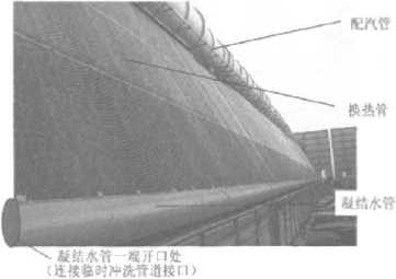 凝結水收集管的清理。凝結水收集管用于匯集各個換熱單元冷凝下來的凝結水,并引流至熱井,管徑一般較小。這段管道水平段較多,1臺600MW機組空冷系統凝結水收集管水平管(dl68mm,圖7)累計長達約960m,現在的冷態沖洗因沖洗水流量太小無法達到,所以特別建議對凝結水收集管進行單獨且大流量沖洗,仍然用沖洗凝結水管時安裝的臨時沖洗管道,將原先的凝結水管沖洗出口端封閉,打開凝結水收集管的進水閥門,將收集管上的排污法蘭打開,用高速水流將收集管內部的污物沖出系統,從凝結水收集總管處的排污法蘭處排放。沖洗至出水清澈、無大顆粒雜質為止。然后關閉排污法蘭,仍用臨時沖洗水對凝結水收集管及熱井進行沖洗,將雜質沖到熱井,后清理熱井。人工清理熱井時,可以先進行掃除,然后用海綿將泥水吸凈,后,用面團粘除細小的機械微粒。此外,建議凝結水收集管在安裝時整體呈一定的斜率,向下連接至熱井。