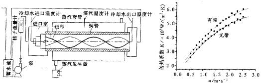 進行了銅管內安裝冷凝器自動膠球清洗裝置前后的傳熱系數對比試驗,試驗系統如圖2所示。用水泵抽出水池中的冷卻水,經過轉子流量計測出流量后,進入冷凝銅管帶動管內的螺旋冷凝器自動膠球清洗裝置旋轉;冷卻水的進出口溫度由精密溫度計測出;銅管外加熱蒸汽由40kW的蒸汽發生器供給。改變冷卻水的流速,測出冷凝銅管內安裝冷凝器自動膠球清洗裝置前后兩種工況下的傳熱系數。對比試驗的結果如圖3曲線所示。