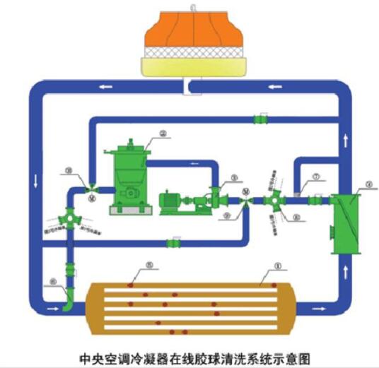 膠球清洗裝置{中央空調(diào)冷凝器自動(dòng)在線膠球清洗裝置}系統(tǒng)原理:其基本原理就是借助水流的作用,將濕態(tài)直徑稍大于冷凝管內(nèi)徑的膠球