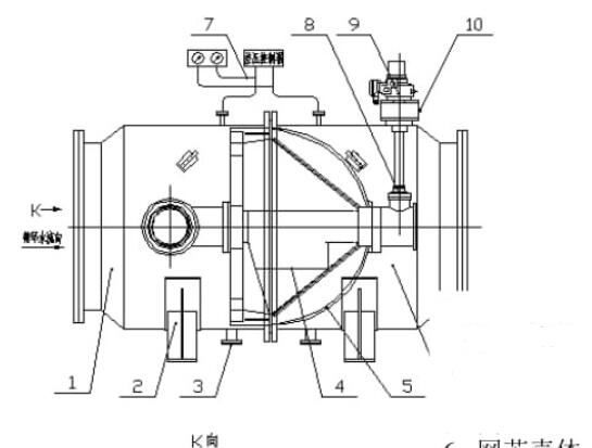 1.進水殼體;2.馬鞍座;3.放水管;4.排污斗;5.網芯;6.網芯殼體;7.測壓管路;8.傳動系統;9.排污斗電動裝置;10.接近開關;11.檢修人孔門;12.排污彎管。膠球清洗裝置系統二次濾網技術特點: