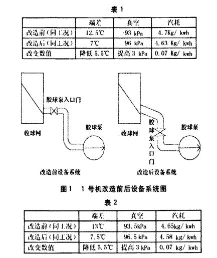 2號機改造前后主要指標對比見表1。對比2號機膠球清洗裝置系統(tǒng)改造前后的效果,我們認真進行了分析研究,決定對1號機原