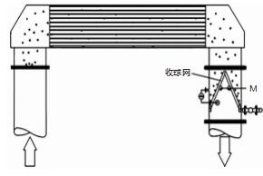 收球網狀態為關閉狀態,結構包括收球網本體、電動執行器、軸承、收球網支架、收球管道、閥門、差壓變送器和密封墊等部件,正常運行時收球網是打開的,而投球及收球狀態下收球網是關閉的,防止膠球漏至長江。