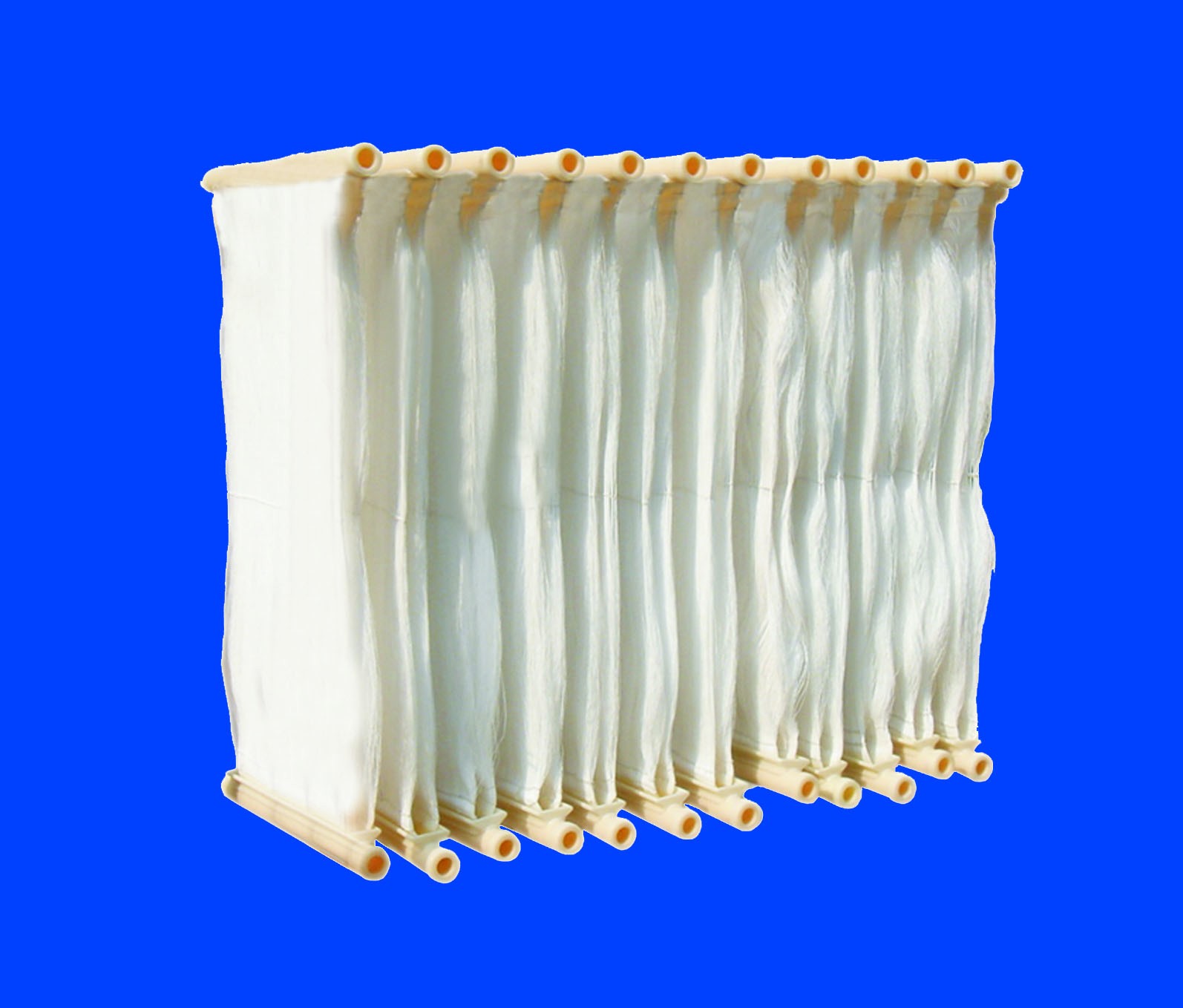 MR系列浸入式中空纖維膜片(簾式膜)是專門為膜生物反應器(MBR)配套而研制開發(fā)的膜組件,采用中空纖維外壓式分離膜纖維制成,有如下特點: